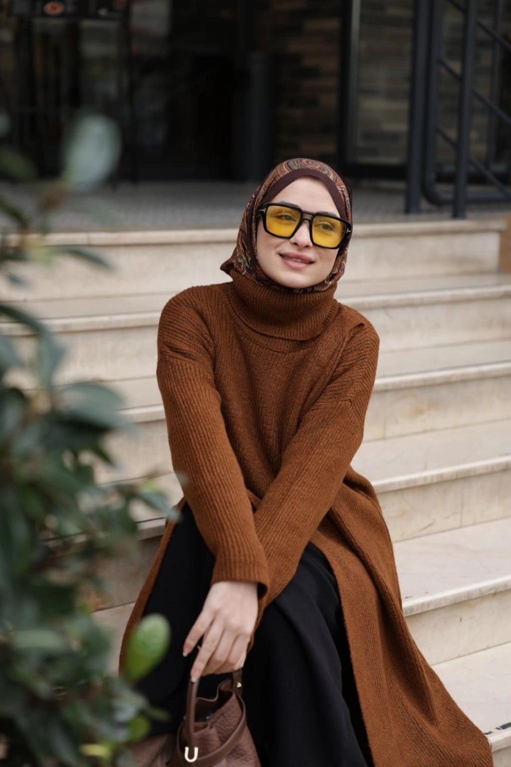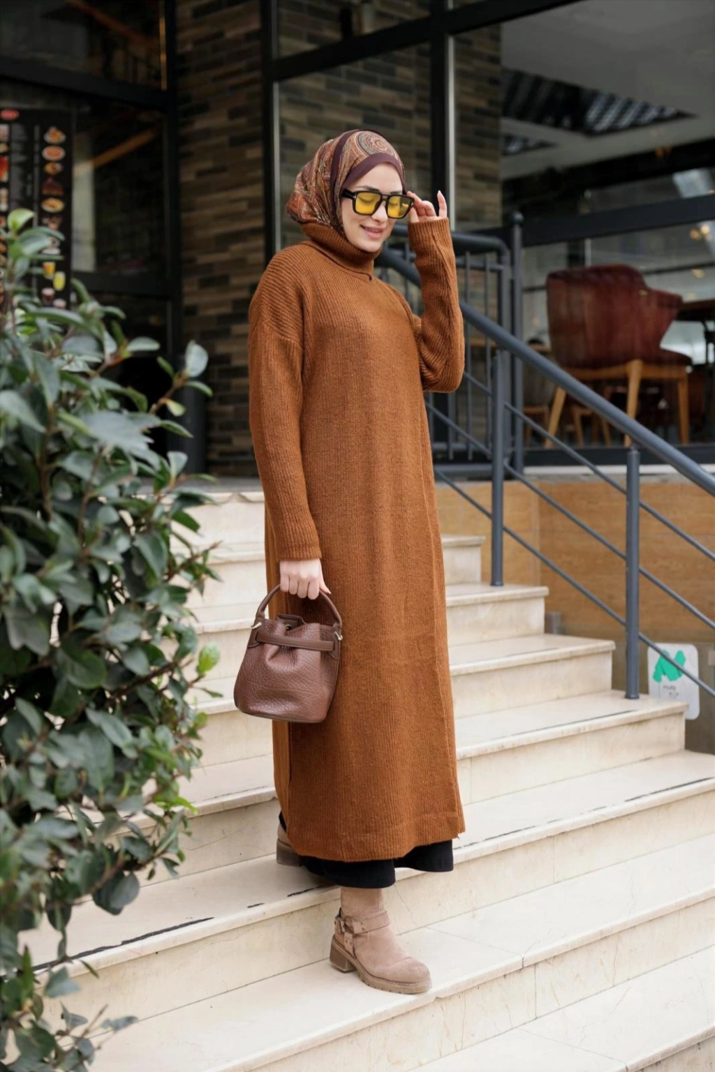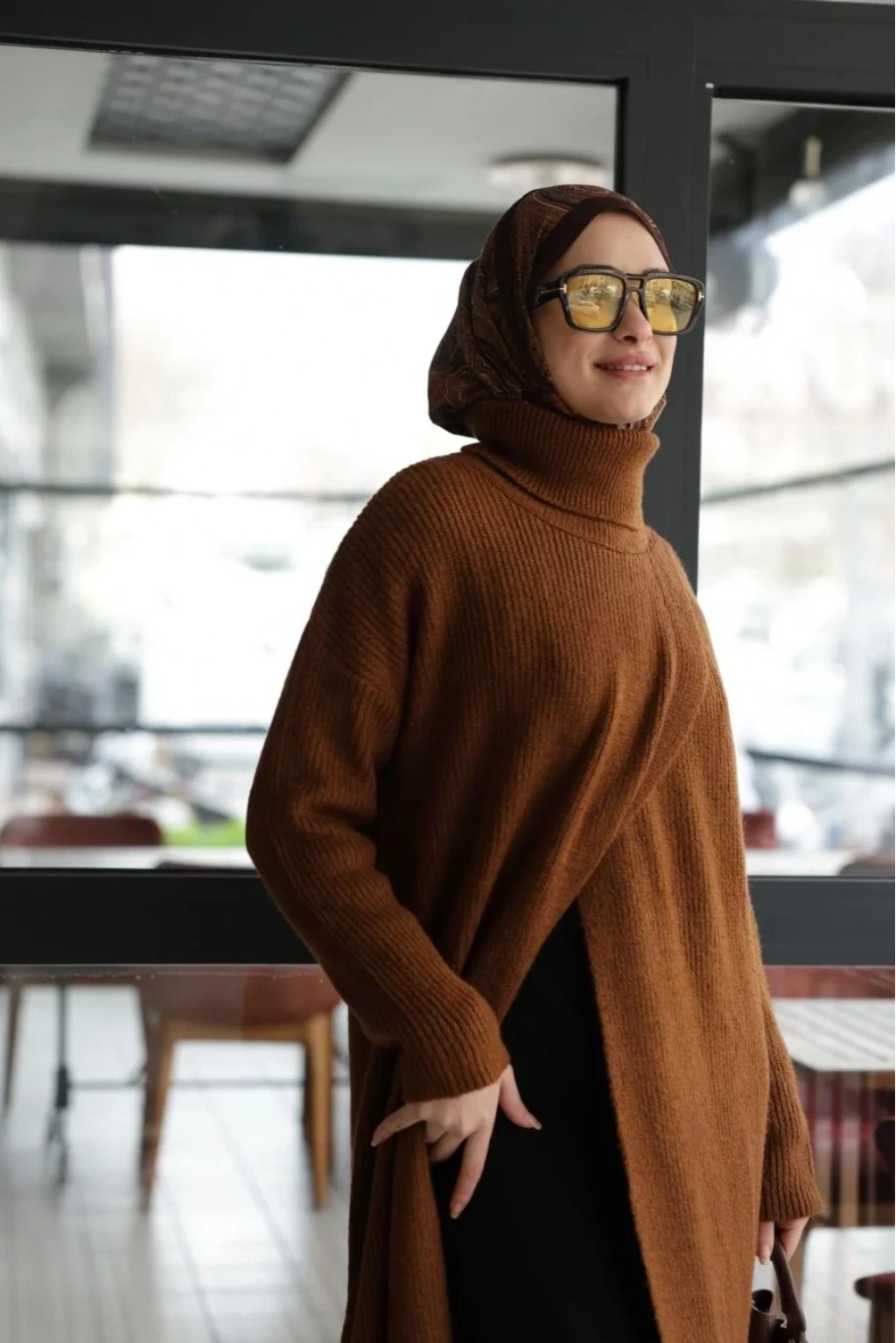 Balıkçı Yaka Triko Tunik Boydan Yırtmaçlı Kiremit