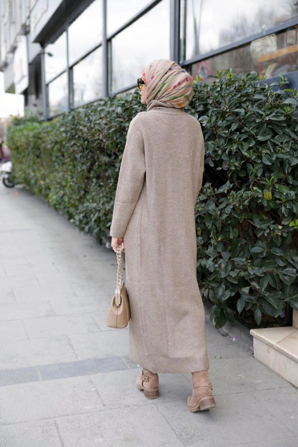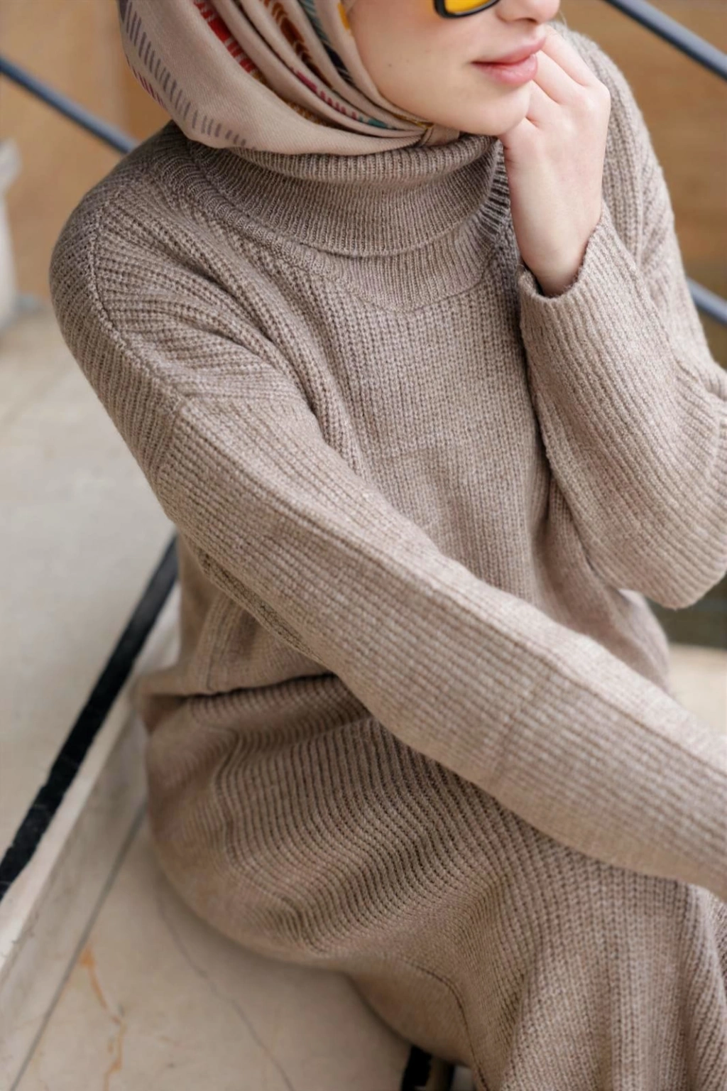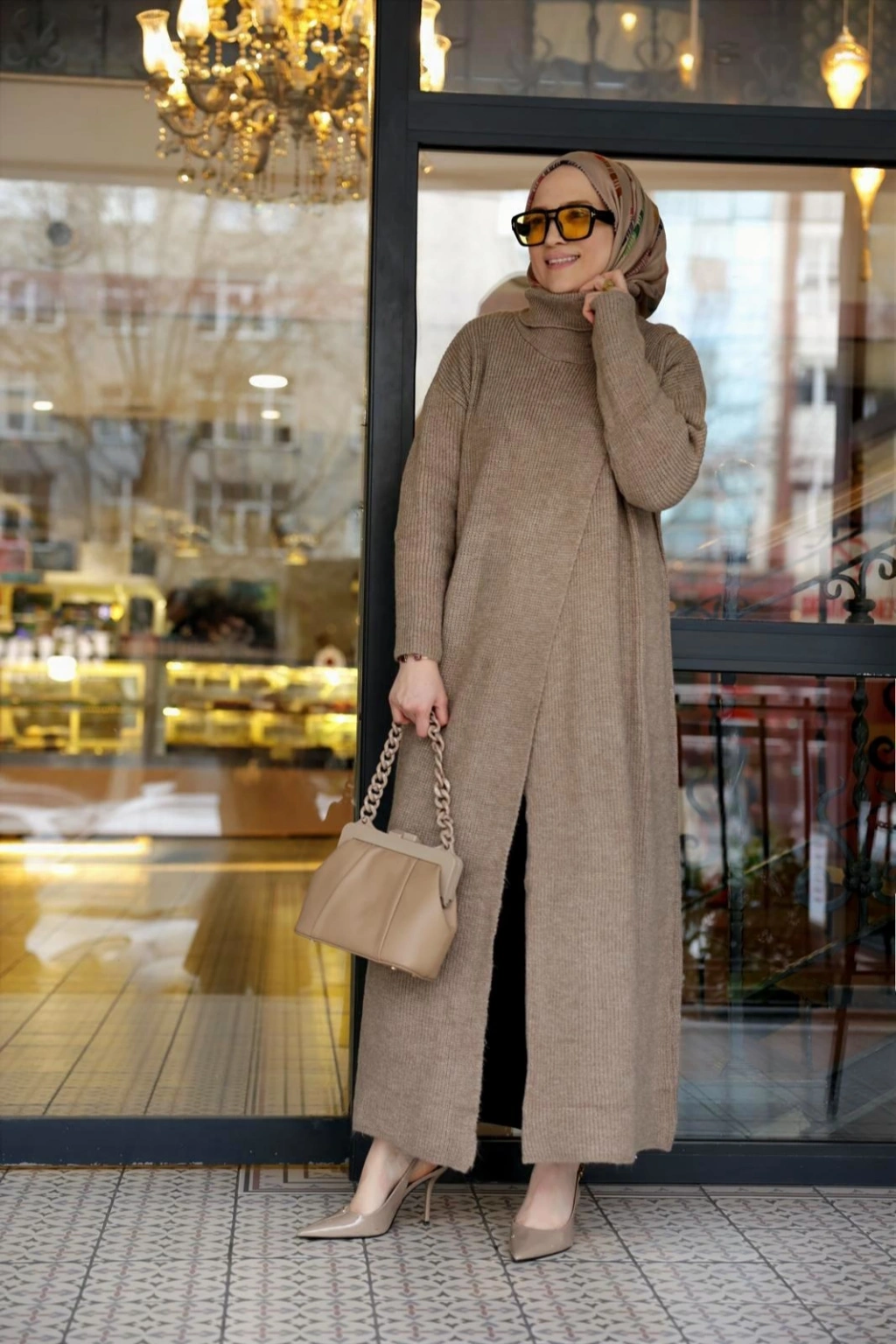 Balıkçı Yaka Triko Tunik Boydan Yırtmaçlı Bej