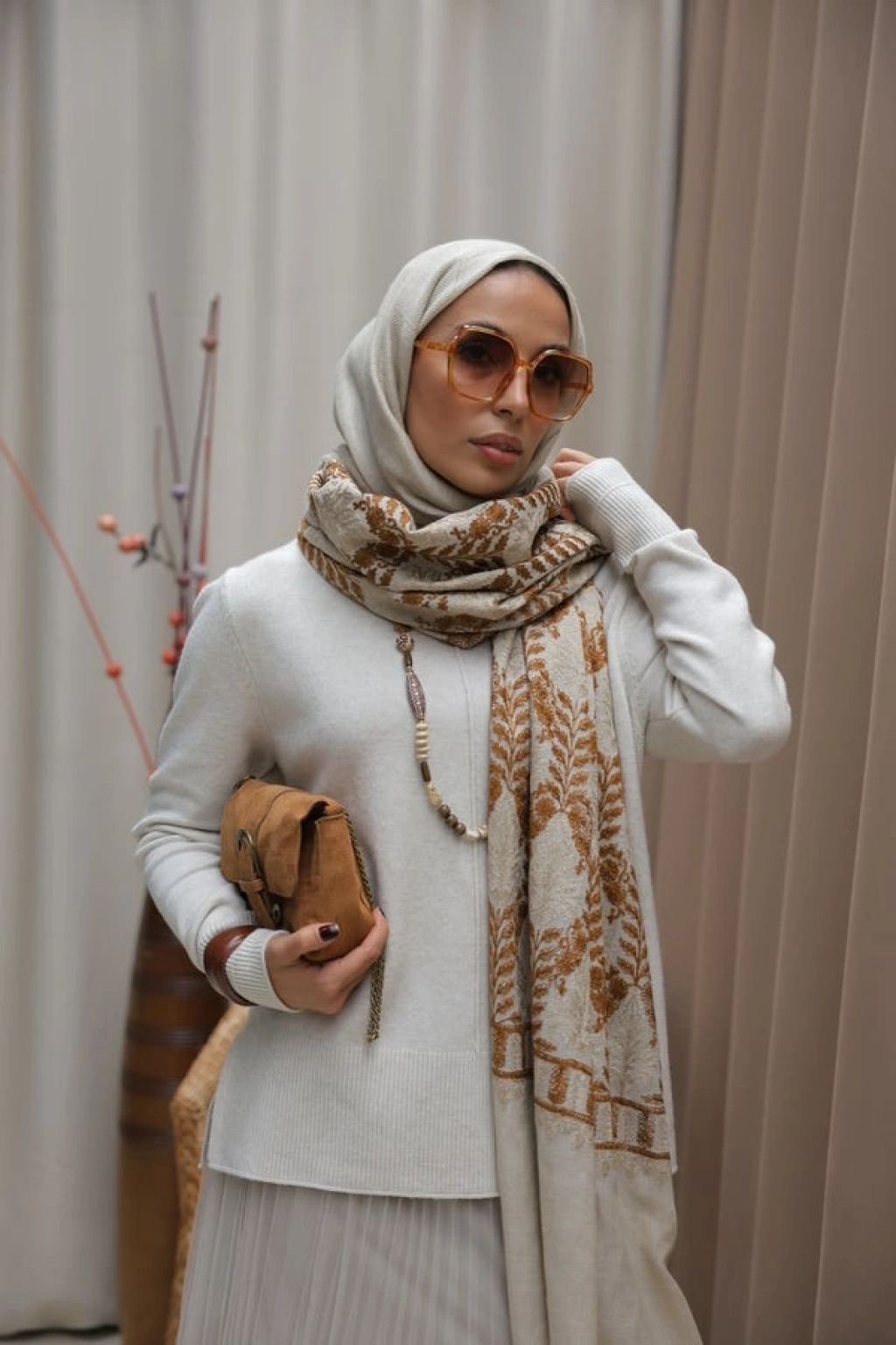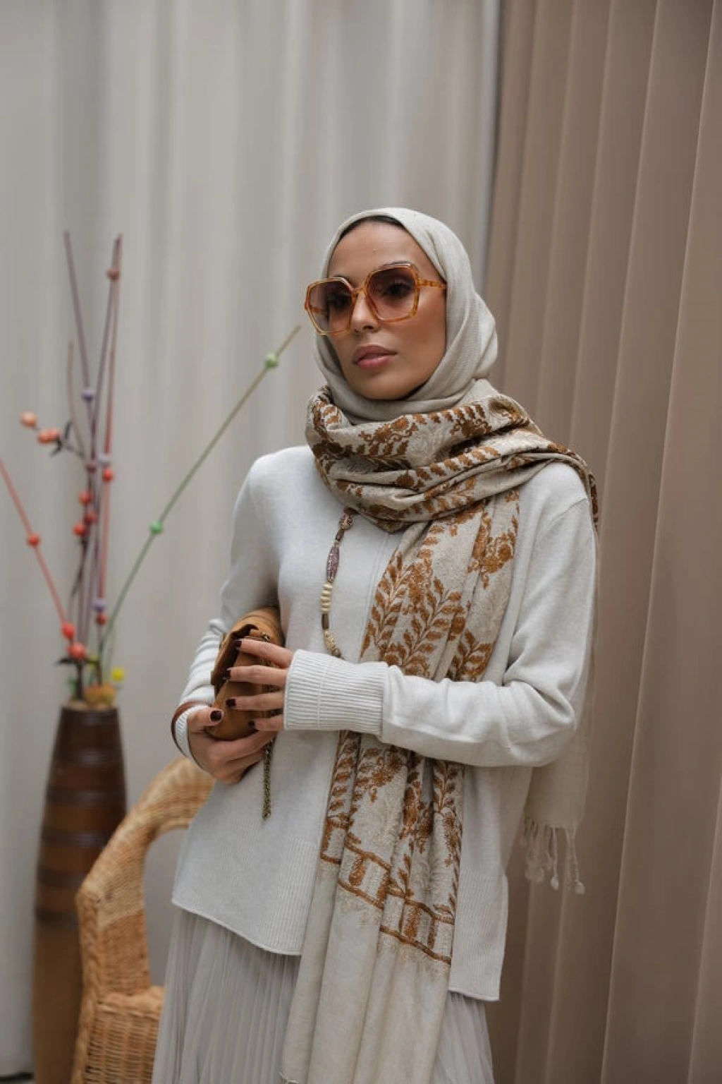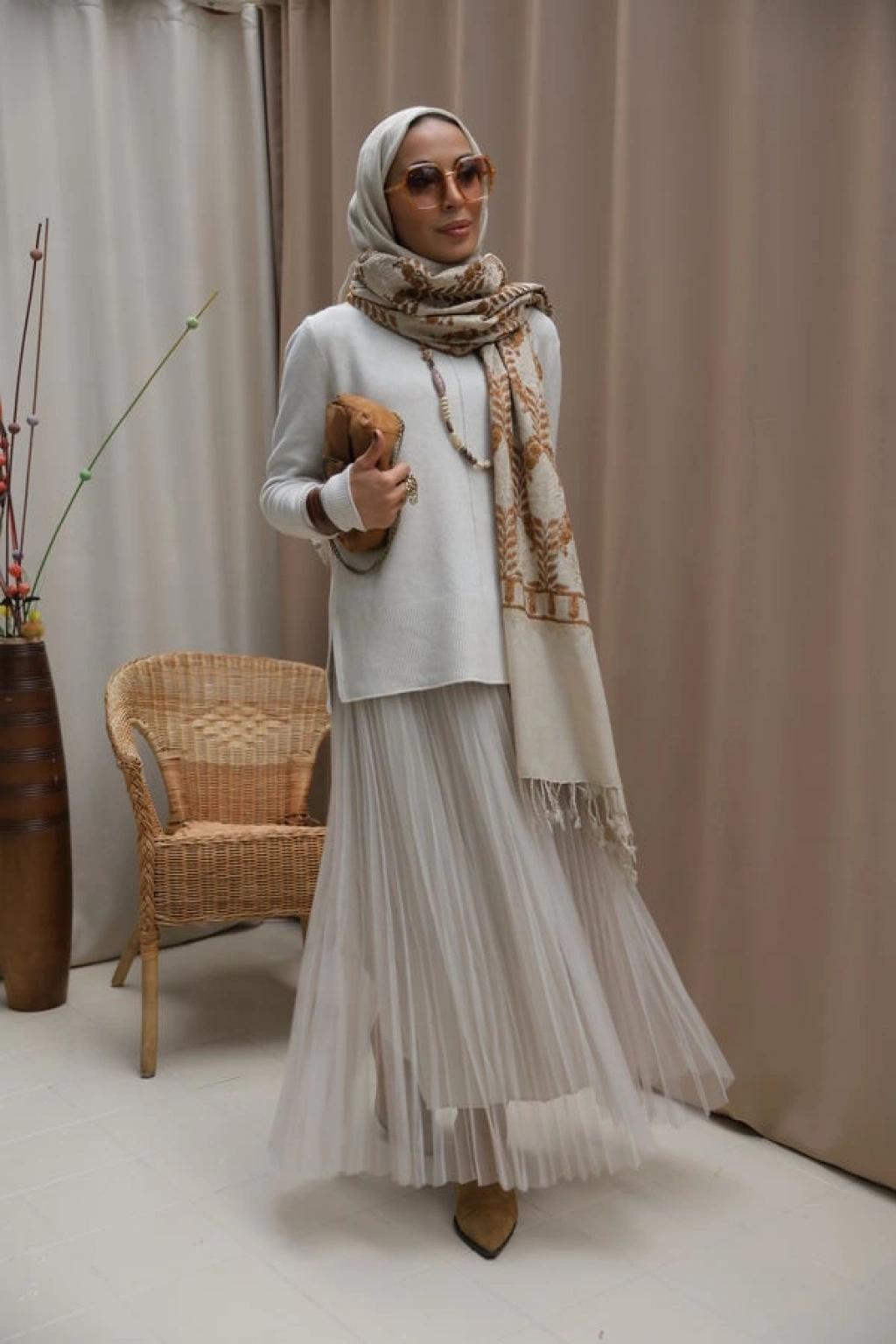 Kadın Asimetrik Dikişli Tüllü Triko Takım-Ekru