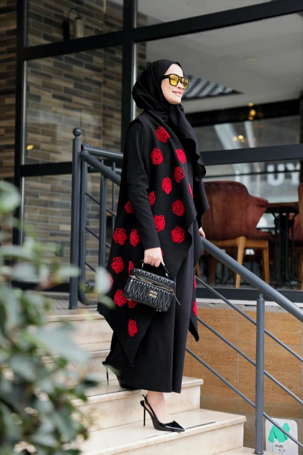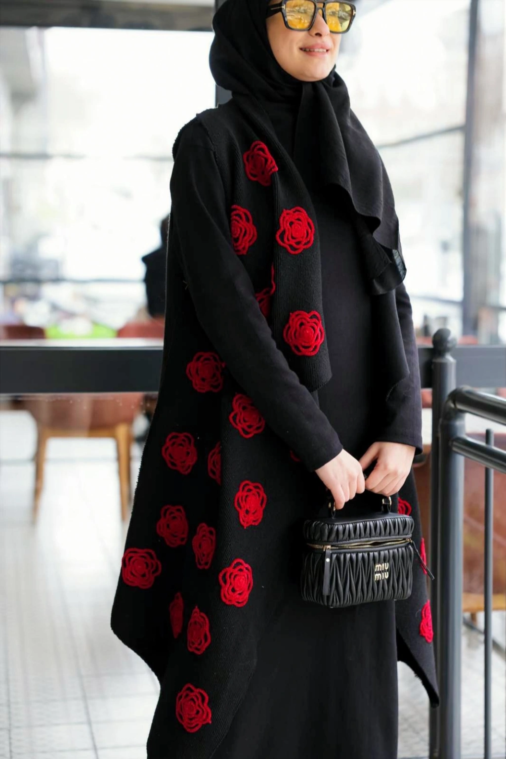 Süzene Bordo Çiçek Nakışlı Yelek Siyah