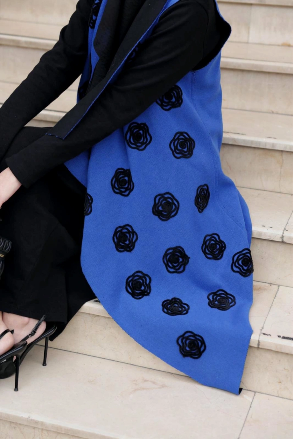 Süzene Siyah Çiçek Nakışlı Yelek Mavi